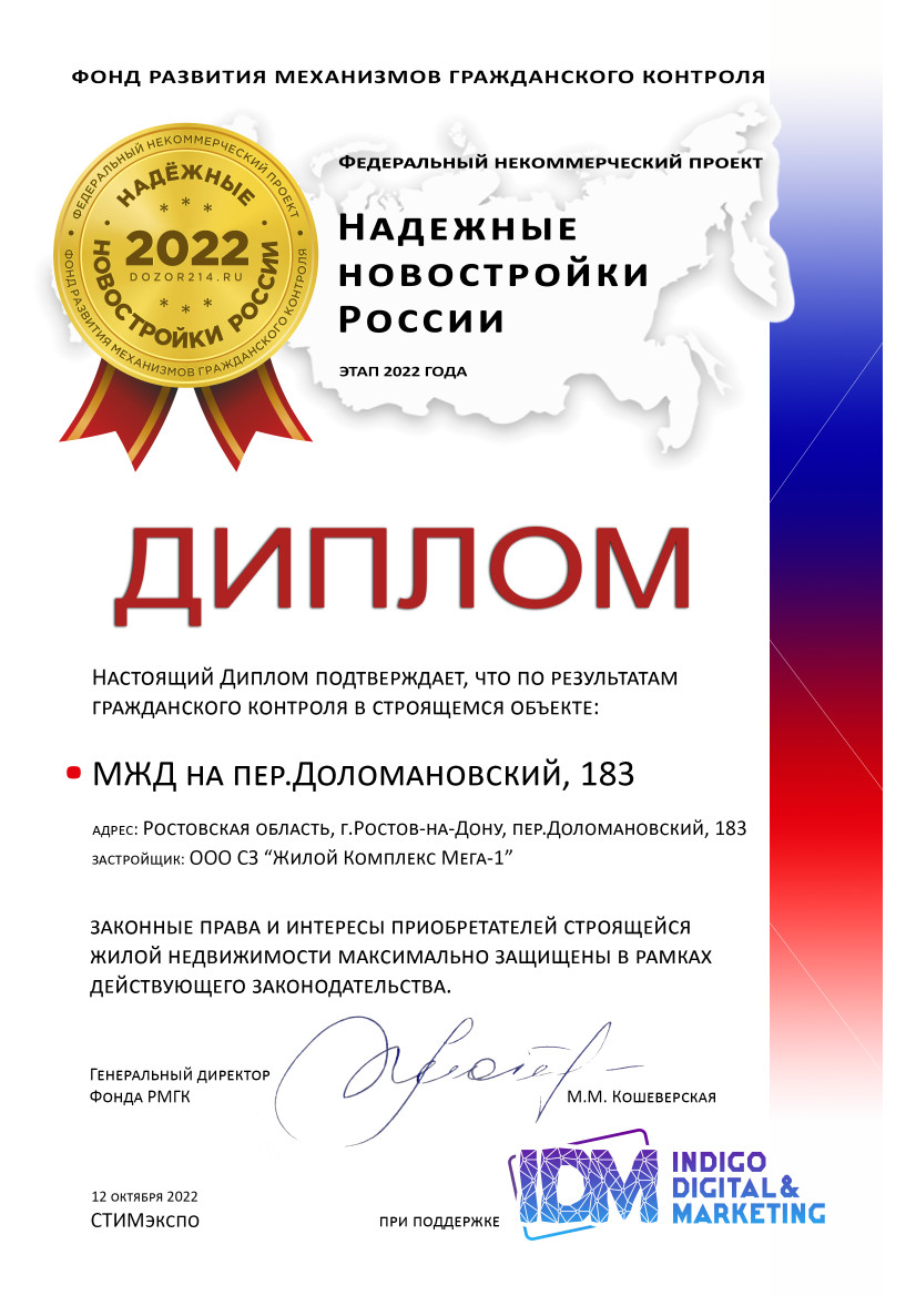 По результатам конкурса, строящиеся объекты, имеющие максимальные показатели надежности (максимальные гарантии законных прав и интересов участников долевого строительства в рамках действующего законодательства) награждаются Дипломом «Надежные новостройки России 2022». Диплом подтверждает высокий уровень соблюдения законных прав и интересов участников долевого строительства и осуществление гражданского контроля за строительством объектов компании на протяжении 2022 года.